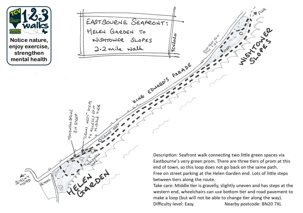 I have not included any other seafront walks because no one needs a map to go straight out and back, but this one is here because it makes a very skinny loop. There are lots of little sets of steps that connect each of the layers to change tier, to vary the route or make the walk shorter.