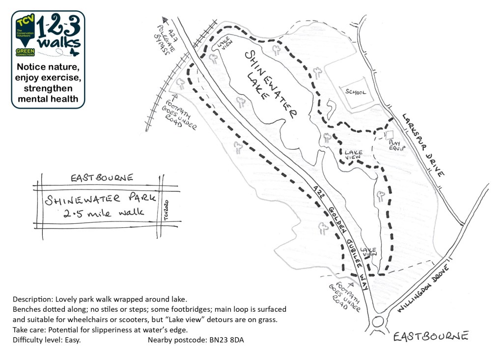 A surfaced path all the way round Shinewater Lake – pretty scenery, interesting features and water views.