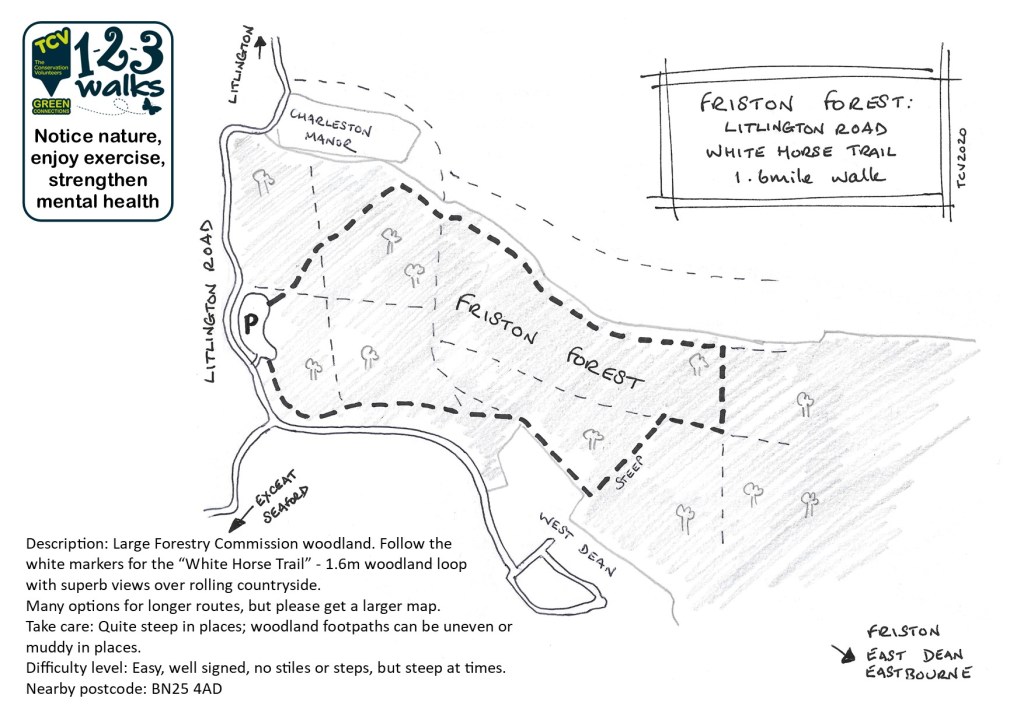 Mostly stone-surfaced paths so it shouldn’t get too muddy. Also see the Friston Forest Butchershole walk and the Jevington Lullington Heath walk.