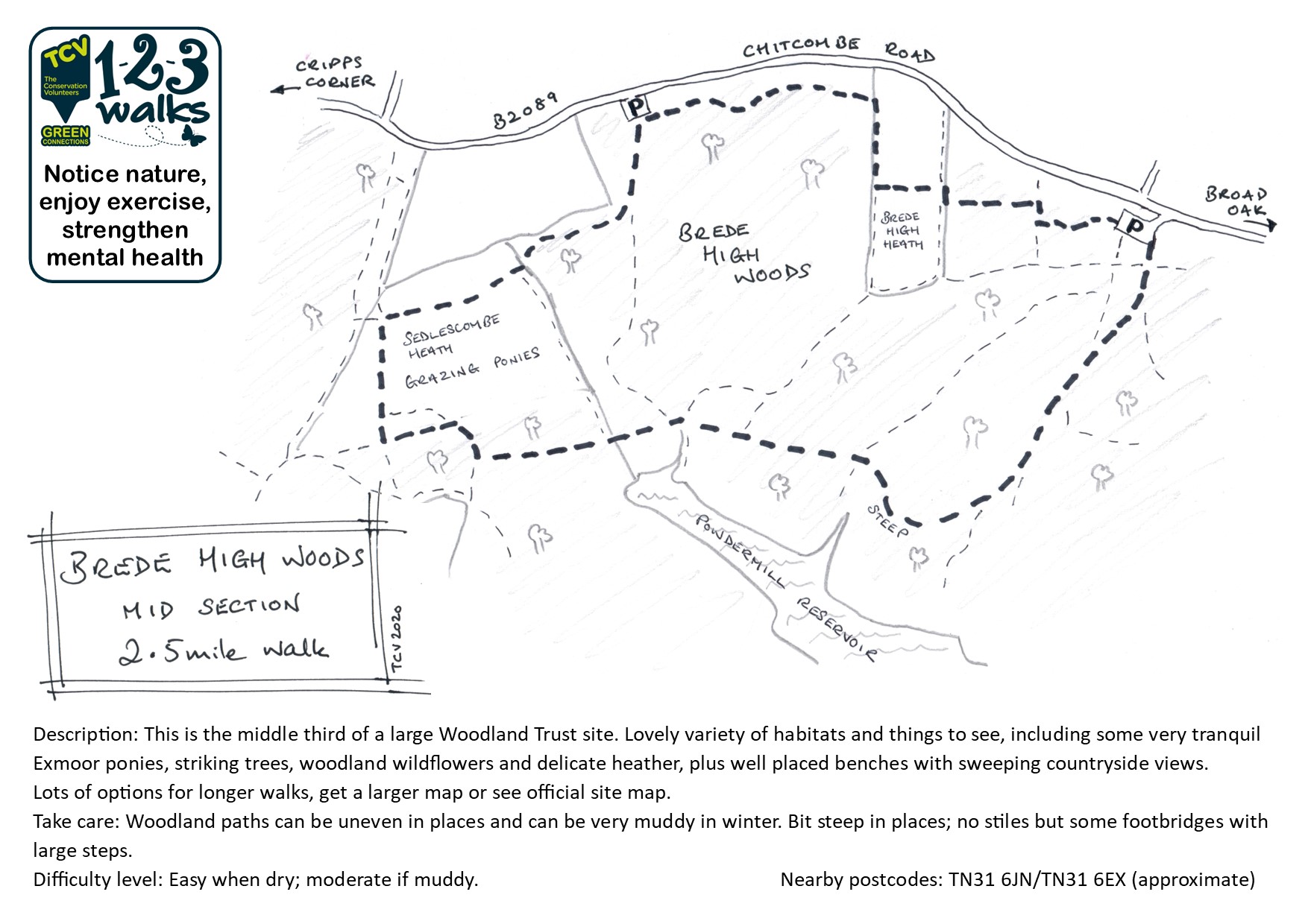 A large Woodland Trust wood with many walk options… and grazing ponies!