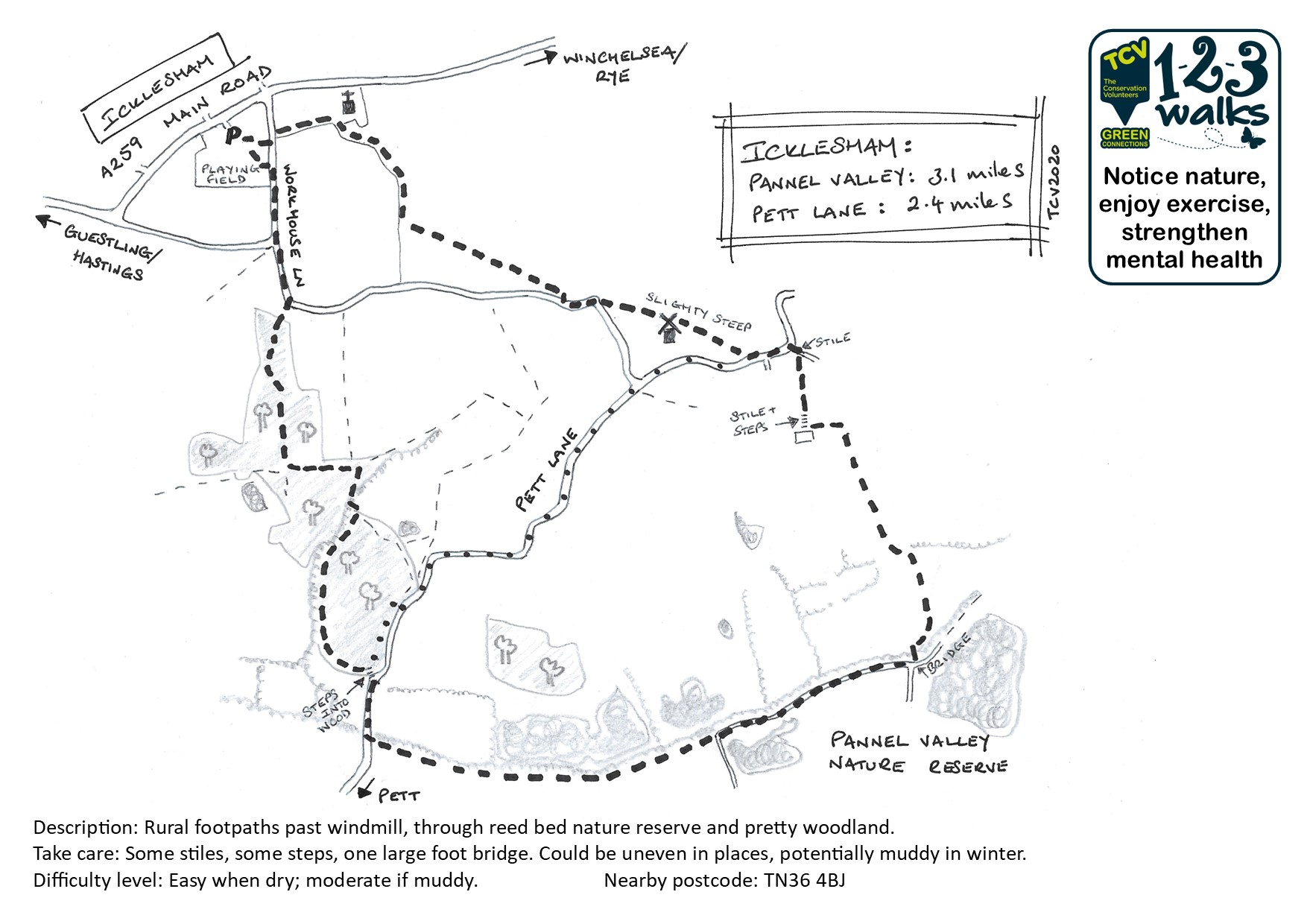 Starting at Icklesham Rec, this walk goes up to the windmill then down the valley to the reed-lined river, then weaves back up through a little wood. Stunning views.