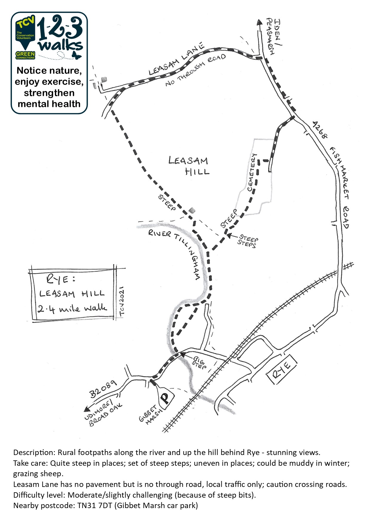 Health walks: if you would like to join a group walk from here, our Rye Health Walk meets in this car park every Monday morning just before 10am. It’s a completely free one hour walk, no need to book, just pop along.