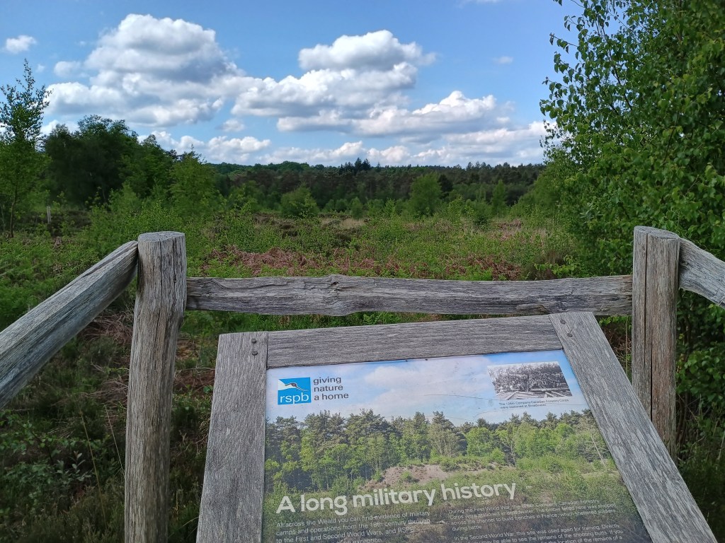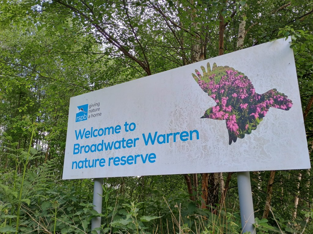 Broadwater Warren is an RSPB forest and heathland. Follow the white arrows clockwise for the 1.5 mile Nature Trail or the green arrows anti-clockwise for the 3 mile Heathland & Woodland Trail (yes, direction matters because the arrows are only on one side of the posts). You can pick up a leaflet with a map at the info stand in the car park. This 123 map is mainly the green route with an extension into the neighbouring reserve.