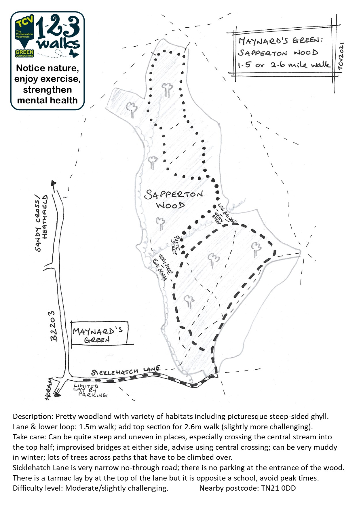 Note: no parking down by the wood but there is a small surfaced layby at the top of Sicklehatch Lane. This is opposite a school, so avoid drop off and pick up times.