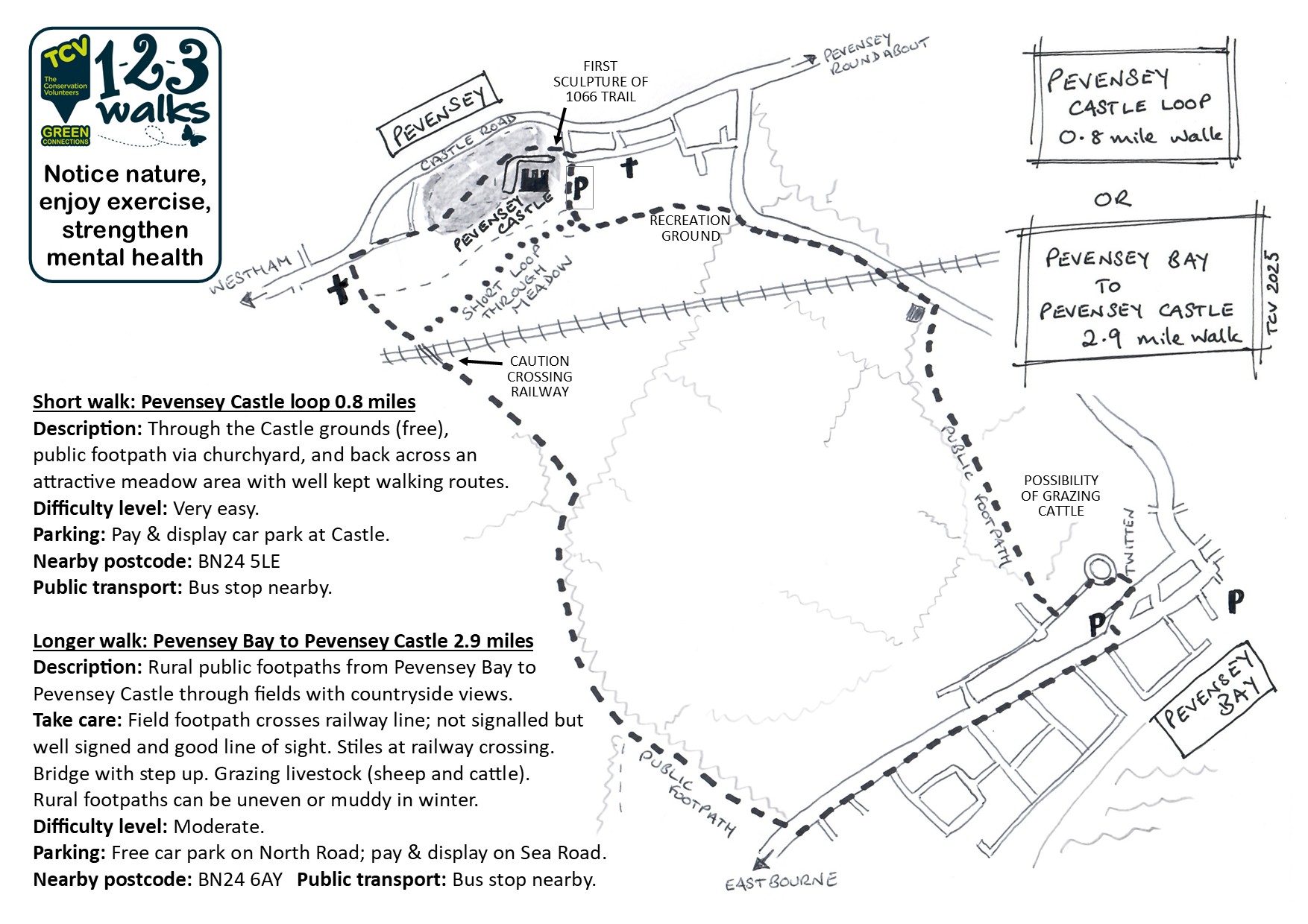 Parking: pay & display car park at Castle; free car park on North Road in Pevensey Bay or large pay & display on Sea Road, plus toilet block. Public transport: nearby bus stops.